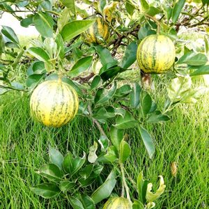 柑橘系の木になっていた気になる実が メロンみたい🤔 レモンピンクレモネード(ピンクレモン)🍋 葉まで斑入りです。 果肉は美しいピンクで種が少ない😃✌️
