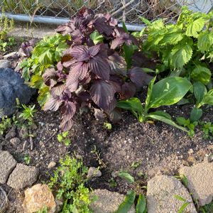 赤紫蘇、青紫蘇。庭を始めまわりにはよく赤紫蘇青紫蘇が生えてきます。私も植えた覚えはなく、毎年たくさん生えます。 野鳥の仕業かしらね。 これはカンナの場所に生えたものです。 紫蘇穂は天ぷらでいただきます。