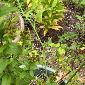 バラの苗木を買い、土も鉢も新しいはずなのにオトギリソウが生え、オトギリソウの花が終わったと思ったら、なんとトマトが生えている。 なんで?土はバラ用の新しい土だよ。 肝心のバラは水不足栄養不足でか葉を落としてしまい影が薄くなりました。