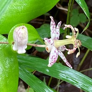 山路の杜鵑草 ヤマジノホトトギス ユリ科 ホトトギス属 分布 北海道南西部 本州 四国 九州 花期 7〜9月 特徴 ・花被片が平開しそり返らない。 ・花糸の下部に紫斑点がない。 ・花は葉腋に1〜2個つく ・茎に下向きの毛が密生する。 と されているようだがヤマホトトギスと紛らわしいのも多々あるようだ。