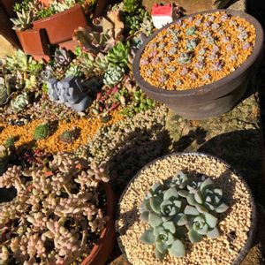 鉢減らしの為にセダム集合〜。 取れた葉っぱを別ポットへ、、 結果、マイナス1鉢。。。