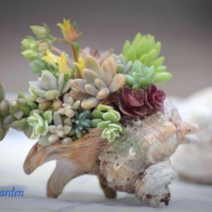 何年も昔…子供達と行った海のお土産🏖🐚に寄せ植え…🌱 つめつめしていたら、海の香りが〜🌊 いやいや👋…全く しませんでした😢
