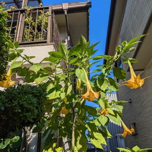 おはよう御座います☀ 🌅朝日に輝くエンゼェルトランペットflower!!💖 今年は台風🌀にも会わずに〜自然体の大木!!エンゼェルトランペット👏😄🎶 次から次へと咲き✨ 凄いなぁ〜嬉しいなぁ〜 さすがにトランペットやね〜パンパカーパーン🎺🎉 癒やされてね🙋💕