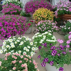 ☔が降るので車庫に待避させているペチュニア、カリブラコア 早く日差しが欲しいですね☀️