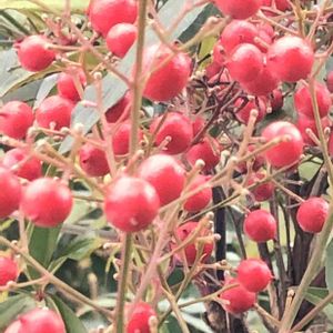 我が家の南天、 沢山実がついてほしい! 先日、地吹雪で横になってました。
