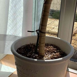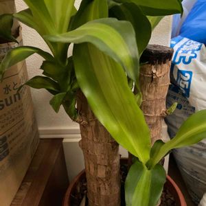 幸福の木 (ドラセナ)。 多分20年くらい育てています。 横から新芽が出かかっても途中で止まってしまい、一本がすくすくと伸び、とうとう天井まで届いてしました。 枯らしてしまいそうで切り戻す勇気が出ず、放っておきましたが、いよいよ放置できなくなりました。 剪定や挿し木の方法が書いているものをネットで調べまくり、道具を揃えて、とうとうやりました。 親木はそのまま植え替えはせず、一番上から3本切り、葉が付いている状態のものと、その下の木だけのものを土に植え、もう一本は水耕栽培にしてみました。 比較的難しくないと書いてはあったものの、失敗するのではないかと心配でたまりません。 何とか新芽が出てきて欲しいと願っています。