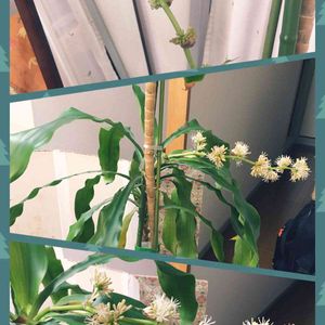 ドラセナ***幸福の木*** 迎えて26年…右上が今日のドラセナ(2代目・3代目🌿) 他は過去pic左下2016年に花が咲いた時のpic *19日🏷️GS句会に参加します ***幸福が 空からあふれ 雪が舞う***