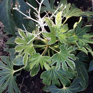 ヤツデの園芸品種 スパイダーウェブです。 日本語で蜘蛛の巣。 長い事鉢植えで老成してしまい開花…。 地植えにして背丈を伸ばしたいです。 斑入りが嫌いな自分の持つ数少ない斑入り植物。