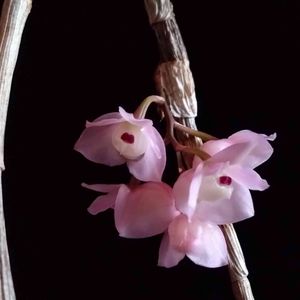 Den.aduncum’Kurahashi’ BM/JOGA アダンカム クラハシが開花しました❣️ 初開花です 2枚目をよ〜く見ると、黒い鼻で、耳の垂れたワンコ🐶がエリザベスカラーを着けている様に見えます🙄 (想像力豊かでしょ😅) 2023年9月サンシャイン蘭展で購入 野口さん1人でお釣りが来ました 事前知識の無い衝動買いです😅 ③小さな鉢で育てましたが伸びる伸びる🫢 現在の高さ125cm😱😱😱 (聞いてないよー) 花茎3本にそれぞれ6輪ずつ開花 花径 幅2cm 高さ2cm ピンク掛かった丸弁の花 香りは感じません 不安定なので3重鉢にしてます