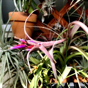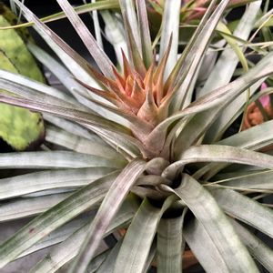 Tillandsia ionantha ‘Druid’ × Tillandsia bulbosa forma alba 約一年前に買ったイオナンタドゥルイドとブルボーサアルバの交配種。 定期的に葉先が紅葉する特性は、子株にも受け継がれて、めっちゃ綺麗。