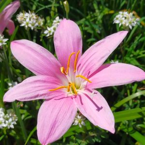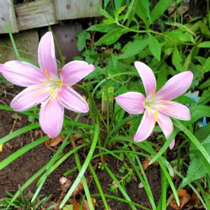 ゼフィランサス コンビニの花壇で ニラに混ざってパァーッと ピンクの花を咲かせていました💗 明るく前向きな気持ちになりました