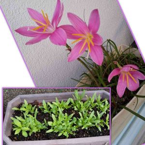 💗ゼフィランサス💗 今回は 3つ 咲きました💗優しいピンクです💗 ↓☘️は 8月に 種まきした 春菊です そろそろ 間引きですね ☘️☘️☘️