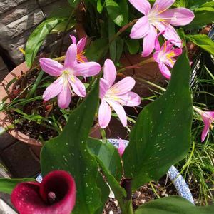 ゼフィランサス・カリナタ ・サフランモドキ ( 別名=レインリリー ) & カラー Zephyranthes carinata Zephyranthes grandiflora ヒガンバナ科ゼフィランサス属 原産地 = 中米 西インド諸島 多年草 花 期 6~9月 花 径 ~7cm 草丈~20cm 花 色 ピンク・黄・オレンジ 知人宅 玄関 前 6月 14日 9時19分に撮影しました🥰