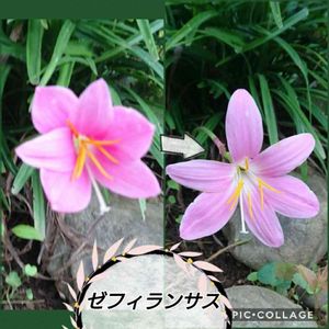 7/11(木)② ゼフィランサス 去年のpicはご近所さん。 でも今年はプランターの位置が変わって写しにくい場所に移動されてました😅💦ご高齢なので少しでも玄関に近い方が水やり楽なのでしょうね。 で、がっかり😞💨していたら、 去年はなかったのに、マンションの庭に昨日(左側)咲いていました‼ヤッタ~⤴️⤴️ 右が今朝です。 もう1輪離れた場所に咲いていますが、花びらを虫に食べられてました😣
