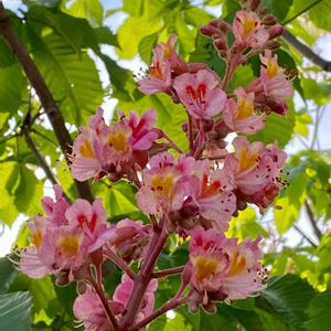 マロニエの花 空に向かって伸びる花は房咲きで、やや黄みを帯びた紅色🌸紅色は濃いものや薄いものまで💕 雄しべが花の外に突き出して咲いています🍀