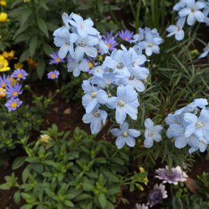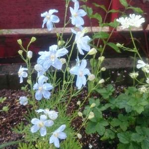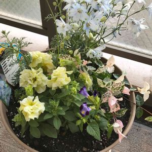 デルフィニウム ハツユキカズラ ペチュニアバーベナ トレニア 寄せ植え