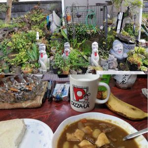 おはようございます 今日もスカッ晴れ 朝の庭が気持ちいいです 朝食は カレーにダブルソフト ちぎって混ぜた ボルシチ風😚 どこが?