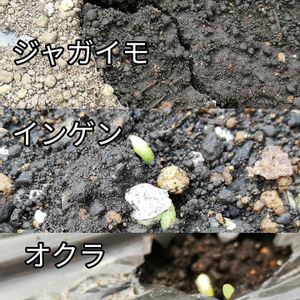 😊おはようございます 朝のパトロールです ジャガイモ 16日目 他にも 土が盛り上がっているので 間違いなく 発芽 です オクラとインゲン 11日目で発芽を確認です いつもこの瞬間は 小さな幸せを感じます🎵