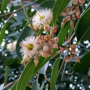 ユーカリ フトモモ科ユーカリ属の常緑高木 名古屋市の平和公園は、大きな墓園ですが、 散策できる森もあります。 一万歩コースの沿線には、4ヶ所くらい、ユーカリの森(圃場)があり、そのうちの1ヶ所で、沢山、花が咲いている木を見られました。 雄しべが、ほわほわっとしたボリュームのある花でした。 東山動物園のコアラの食用として、24種類のユーカリが栽培されているそうです。 樹種によって、花や葉の形や色も、花期も様々だそうです。 違う種類の花も見たかったですが、 この花が見られただけでも、よかったです。 蕾が沢山ついている木もありましたが、コアラが食べるためのものなので、花が咲いたものは、味や食感が落ちるのか🤔? 蕾のついた枝は、刈り払われて、株元にありました😓 最初、実だと思ったものは、蕾のようで、これから、花が咲くようです。