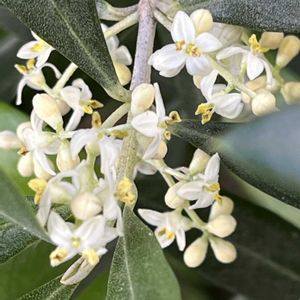 今日のお花 ⁑ オリーブ 🌿🫒🌿 若い果実はピクルスに、完熟した果実はオイルにと利用されるオリーブ🫒 近くにオリーブを沢山育てているお宅があります🌲 ⚫︎⚪︎⚪︎