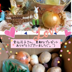 先程、雲仙花子さんより素敵便が届きました💕 ヾ(。>﹏<。)ノ゙✧*。ウレシイ♡ たくさんの自家製野菜🧅🥔玉ねぎ、じゃがいも、インゲン、それから可愛い容器に入ったお菓子💕💕💕 「CAFEで使って〜!」と送って下さったので、🐷さんは玉ねぎをクンクンしながら、料理を考え中…🎶😆 🐰さんは、感謝の気持ちでいっぱいとの事です💞 繋がりに感謝♥ありがとうございました_(_^_)_♡♡♡