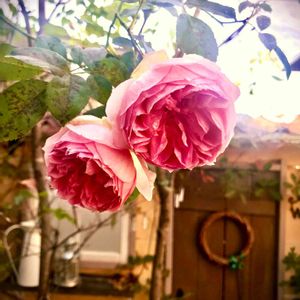 *アミ ロマンティカ つる性 四季咲き〜返り咲き メイアン ピェールドゥロンサールを 一回り、小さくしたような薔薇 違いは頂芽優性を無視して 寝かせなくても 茎からも沢山の花を咲かせる 画期的な薔薇 驚きの花付きです。 また、なんと四季咲き 現在6分咲き まだまだ開花が 楽しみな薔薇です🌹 左側の少し大きな花はダフネ サイズの違いがわかります😊