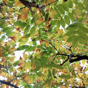 霜月・朔風編✨✨✨ 💚💚💚 お疲れ様です(♡ᴗ͈ˬᴗ͈) 散歩中に ふと 藤の木を見上げて パチリんこ(*ˊ˘ˋ*)。♪:*° 藤の葉が黄葉して 綺麗だねん ふかーく深呼吸して 気持ちいい♡♡♡ 2025/11/07 撮影