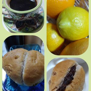 朝食(*´˘`*)♡ 全粒粉入りくるみパンと ブラック珈琲! くるみパンの割れ目に レーズンを突っ込むwww 美味しーーー🖤🖤🖤
