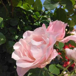 ☆庭のお花達☆ ⬆️サンパラソルクレムソン 2輪目が咲いたよ〜😆 ⬅️🌹クィーンエリザベス、 ブルーベリーの鳥よけの網を 突き抜け、高い所で、 咲き初めました〜 やっぱり可愛い色❣️ ➡️ヒューケレラタスペトリーの お花が沢山咲いてます!