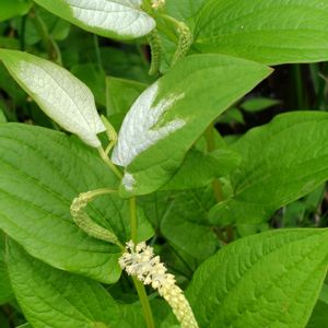 ハンゲショウ ドクダミ科ハンゲショウ属 多年草 本州、四国、九州、沖縄に分布 低地の水辺や湿地に群生する。 別名はハンゲショウグサ、ハンゲソウ、カタシログサ、三白草など 高さ30〜100cm 葉は互生し、卵形〜披針形卵形で、5~15✕2~10cmで、先端は尖り、基部は心形である。 花期6〜8月 香りがある小さな花が多数集まり、長さ10〜15cmの総状花序を付ける。 花序は初めは下垂しているが、後に上を向く。 花期になると花序に近い数枚の葉が白くなる。花期が終わると再び緑色になる。