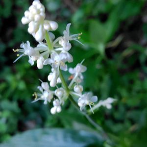 ヤブミョウガ ツユクサ科ヤブミョウガ属 多年草 アジア(日本)原産 関東地方以西に分布 暖地の林縁などに自生する。湿気の多いところを好む。 花期7〜9月 草丈50〜100cm 茎の先端から花序を真っ直ぐ伸ばし、輪状に白い花を咲かせる。 花は両性花と雄花がある。 白い花弁が3枚、萼片も白く3枚、雄しべが6本、雌しべが1本で、花冠は直径8mm程度である。 いずれも一日花であるが、タイミングをずらして次々と咲くため、花期は1ヶ月ほど続く。 今シーズン、初めての出会いです。