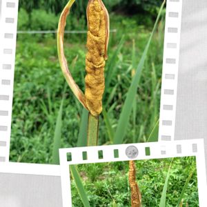 今日のお花 ガマ ①②⑤ガマ ガマ科ガマ属 多年草 沼地、水辺などに生育する。 在来種で北海道〜九州に分布する。 5〜6月頃に花穂が付き始める。 始めは苞というものにくるまれているが、開花とともに自然に脱落する。 上が雄花の穂、下が雌花の穂である。 雄花の穂は開花とともに大量の花粉をまき散らす。雄花と雌花の間はくっついている。 高さ1〜2.5m 雌花穂は果期に 長さ5〜25cm 幅24〜36mm 円柱形 花期6〜8月 ④コガマ ガマより小さい 本州、四国、九州に分布する。 高さ1.3〜2m 雌花穂は果期に 長さ4.5〜15cm 幅10〜20mm 上端がやや幅広い円柱形で濃い褐色 ③ヒメガマ 水辺、湖沼などに生育する。 ヒメガマは変異が多い。 高さ0.7〜2.5m 雌花穂は果期に 長さ5〜23cm 幅15〜25mm 円柱形 一番の特徴は雌花と雄花の間が離れていることで、軸が1〜8cm見えることである。 共通していることは、果実期になると、赤茶色のフランクフルトソーセージのような穂が目立つ。 穂は大量の綿毛付きのタネがぎゅうぎゅうにつまった状態になっている。 穂は成熟すると簡単にほぐれ、タネが風とともに飛び立って行く。