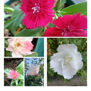 うちの数少ないお花たち ダイアンサス、ミニバラ、ベビーサンローズ ムクゲは今日のお出掛け先で見つけました😄