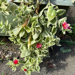 2025.07.17 Mesembryanthemum cordifolium. ベビーサンローズが赤いダイヤを付けました💎 ずーっと前から祖父が育てていて、ん?育てていたのかな?そんなことより!うちでも育てています。 暑さにも寒さにも強く、特別何か手入れが必要でもなくとても優秀な子です。 イメージとしてはマツバギクのような感じなのですかね? 普通に育てているのですが良く伸びるので吊るすとオシャレかもしれませんね。