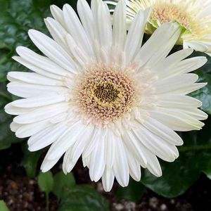 ✽+†+✽ ガーベラ ✽+†+✽ 冬越しのガーベラが真夏に咲きました。 白いガーベラですがたぶん元は違う色合いだったと思います。 きれいに咲いてくれてとっても嬉しいです。