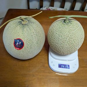 向かって右、メロン狩りのメロン 1419g 左、4月に高校1年の時のクラス会があって、旭川在住の友達をうちに泊めました。先日、その子から富良野メロンが送られてきました。とても大きく甘いメロンでした。重すぎて計れない。