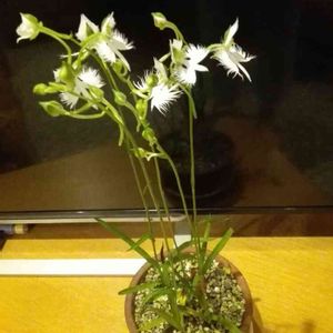 今朝びっくり!他の方のサギソウみていて わが家はと振り返ると、一輪?一双?開いて いました。母の命日近く、好きだったこの花の 鉢を求めました。 幾度球根から育てるのに断念したことか…