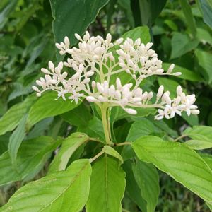 クマノミズキ (熊野水木) ミズキ科の 落葉高木・・・ 三重県~和歌山県の "熊野地方" で 産するの意味で 付いた名前なのだが、本州、四国、九州の 山地では ごく 普通の 樹木である。 日本以外でも 中国本土、台湾、朝鮮半島、ヒマラヤなど アジア各地で 見られるようです。 庭木としての 利用は 少ないが、この時期 樹上に 無数の乳白色の 花を付けます。(1枚目) 時に 山肌が 白くなるほど・・・😯 高木なので、花を近くで目にすることは少ないようですが、特に 綺麗✨と 言うわけではありません。😧 花は 散房花序(2~4枚目)で 花弁が4個、雄蕊は4個で 花盤の縁に付き、花柱(雌蕊)は 1個です。(5枚目) 萼筒には 白い伏毛が 密に生えます。 花1つを マクロで見る機会など まず 無いでしょうから、是非・・・🧐 🏷木曜は木の花