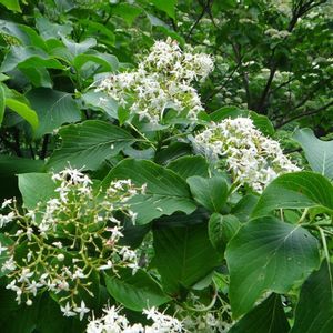 クマノミズキ1年前 見つける 草刈りをしていて 大木に白い花が目立ったので 気付く (里山続きの庭) ※ よく似ているミズキとは開花時期が違い 葉身細長い(約 17cm)