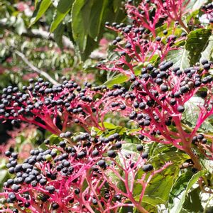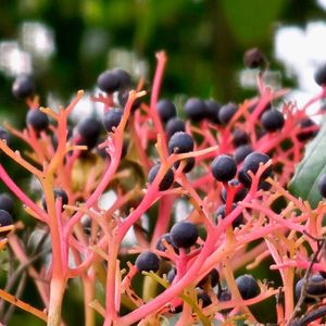秋の到来とともに枝先(花序 果序)が赤くなり遠目には赤い実がなっているように見える② ①2025.10.2 黒く熟してきたクマノミズキの果実 資料にはクマノミズキの果実は緑色と黒色が混合し ながく鳥たちに果実の提供を続けるというが ここではすでに一斉に黒くなっていた ③2025.8.8 開花から2か月 緑色の果実が実っている 枝の先は肌色 果期は7-10月なので①10月2日の写真は果熟も終盤を迎えているようです ミズキ科ミズキ属の落葉高木 寒さに弱く 本州南部 四国 九州の山野に分布します またよく似ているミズキは葉が互生 クマノミズキは対生することで区別します