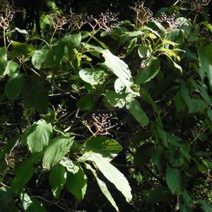 クマノミズキ(熊野水木) ミズキ科ミズキ属 落葉高木 ミズキとの違いは、葉が対生であること、葉柄が葉身の半分程度で短いこと、棚状の枝とならないことなどにより区別。 11月2日 場所:浜松市天竜区 常光寺山