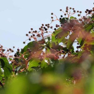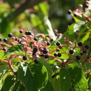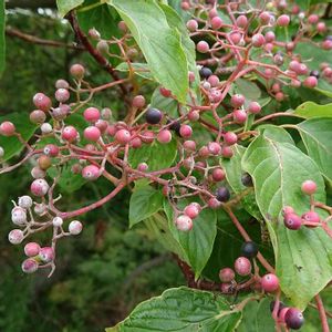 こんにちは~ 「私の名は?」シリーズ44 五岳の里公園、高さ3.5m位でピンク色の新芽と緑色の可愛い実を沢山付けていました。 はちなつめさんとセッチさんがクマノミズキと教えてくださいました。 撮影日 2020.8.26 以下、メモです。 クマノミズキ(熊野水木)はミズキ科の落葉高木。熊野に自生するミズキという意味で命名されたが、実際は本州から九州まで山野で普通に見られる。葉は長さ10~15cmほどで縁のギザギザはほとんどない。幹や枝葉の様子はミズキによく似る。花期は6~7月で雄しべが目立つ小さな四弁花が棚状に集まって咲く。近付くと芳香がある。花後にはグリーンピース大の緑色の実ができ、秋が近付くにつれて付け根が赤くなるため、遠目には赤い実がなるように見える。実は10~11月頃に黒紫色に熟す。