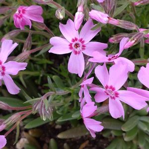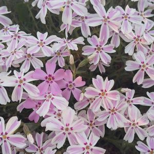 今日のお花 シバザクラ 薄紫、白、キャンディストライプの順に咲いてきました ピンクはまだ蕾です