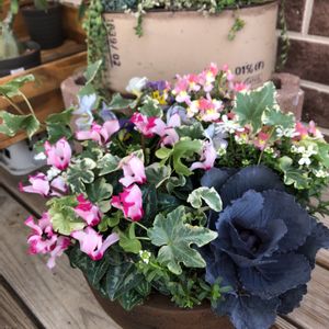 ハボタン・チタニウムシルバーを使って♪ ハボタン・チタニウムシルバー 1pot ガーデンシクラメン 1pot ビオラ・クリスタマーメイド 1pot ネメシア・メーテル 1pot アイビー・セシリア 1pot イベリス 1pot を使ってます😃 ネメシアの甘いもの香りがいいですよ😊