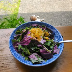 父の新作 水前寺菜 キク科サンシチソウ属、多年草 標準和名では「水前寺菜(スイゼンジナ)」といい、東南アジアが原産とされるキク科の多年草です。 熊本県の水前寺地区(現在の熊本市中央区水前寺町)で湧き水を利用して栽培されたことから水前寺菜と呼ばれるようになったそうです。 葉の部分と若い茎を食用とし、この葉の色に特徴があり、表面が濃い緑色に対し、裏は鮮やかな紫色をしています。 この葉の裏の色が金時(キントキ)芋の色によく似ていることから、加賀地方では金時草と呼ばれるようになったとか。 また、その葉は少し厚みがあり、折り曲げるとパリッと割れるような肉質ですが、茹でるとぬめりが出て、ワカメのような食感になります。カロテン、ビタミンC、カルシウムやカリウムが豊富です。 と,調べたら書いてありました。 美味しい食べ方教えてください♪ 生でかじってみたら,パンチ凄めでした‼️