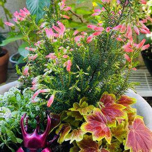 🏷「オケツの日」に参加させて下さい🙌 先程作った寄植え💫いかがでしょう⁉️ ⬆️ツツジ科 エリカ属 ↘️フウロソウ科 テンジクアオイ属 ↙️アブラナ科 ロブラリア属