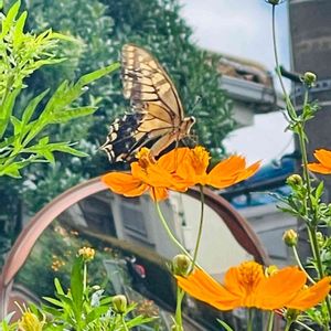 お早う🧡ございます🙋♀️ 🌼今日のお花🌼 キク科 コスモス属 メキシコ原産 💠未来都市の様な風景の中❣️ アゲハ🦋も参加してくれました💅