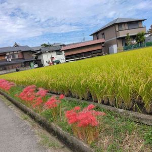 朝散歩🚶♀️6日め 曼珠沙華と稲穂🌾と空があまりに美しくパチリ📸10月初日の秋の風景。