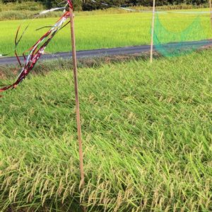 タンボ道をゆけば🚶♀️ 稲穂🌾が色づき、頭を垂れていた。 長梅雨と猛暑に耐えて よくここまで頑張ってきたね。 鳥避けのキラキラ、ヒラヒラ みんな一生懸命だね👍