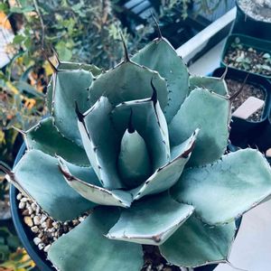 皆様お久しぶりですm(*_ _)m 半分溶けてましたがダイプー生きております😆😆😆 そして先日初お伺いしたアガベの聖地 カトー園芸さんで久しぶりにアガベ君 get( *˙ω˙*)و グッ! 私がアガベに惹かれたきっかけはnetで みた👀パリートランカータでした(ノ*°▽°)ノ それから ホリダ チタノタ 笹の雪 アテナータ ポタトラムetc.... 色々お迎えしましたが(´ー`*)ウンウン ちょいと1周して戻ってきた感😆 パリー・トランカータ・ハンティントン君 輸入株で発根して少し安定してきたという 事だったのでお迎えしました〜(ノ*°▽°)ノ これからより白くなってくれるでしょう🤩 ハンティントンとは より白く、より幅広葉でより丸い(´ー`*)ウンウン そんな素敵パリーが作出された場所らしい です(´-ω-)ウム そのクローン株って事でしょう😆 ちなみにパリーは若干高山性らしいので 風に当てる事を意識した方が良いらしい ですφ(・ω・`)メモメモ